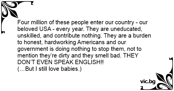 Four million of these people enter our country - our beloved USA - every year. They are uneducated, unskilled, and contribute nothing. They are a burden to honest, hardworking Americans and our government is doing nothing to stop them, not to mention they’re dirтy and they smell bad. THEY DON’T EVEN SPEAK ENGLISH!!
