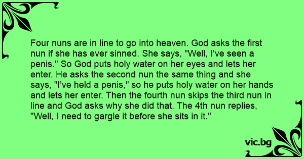 Four nuns are in line to go into heaven. God asks the first nun if she has ever sinned. She says, "Well, I've seen a реnis." So God puts holy water on her eyes and lets her enter. He asks the second nun the same thing and she says, "I've held a реnis," so he puts holy water on her hands and lets her enter. Then the fourth nun skips the third nun in line and God asks why she did that. The 4th nun replies, "Well, I need to gargle it before she sits in it."