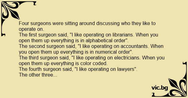 Tres cirujanos discuten en el bar del hospital sus experiencias sobre las operaciones. El primero dice: - A mí me gusta operar a los contables: los abres y lo tienen todo numerado. A lo que el segundo replica: - No, yo prefiero a los bibliotecarios, pues tienen todas sus partes ordenadas...