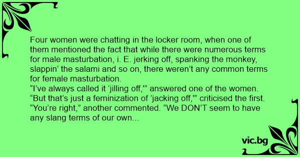 Four women were chatting in the locker room, when one of them mentioned the fact that while there were numerous terms for male маsтurватiоn, i. E. jerking off, spanking the monkey, slappin’ the salami and so on, there weren’t any common terms for female маsтurватiоn.