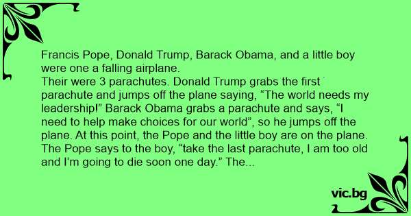 Their were 3 parachutes. Donald Trump grabs the first parachute and jumps off the plane saying, “The world needs my leadership!” Barack Obama grabs a parachute and says, “I need to help make choices for our world”, so he jumps off the plane. At this point, the Pope and the little boy are on the plane. The Pope says to the boy, “take the last parachute, I am too old and I’m going to die soon one day.” The little boy says, “actually their are two, you see, Donald Trump took my backpack.”