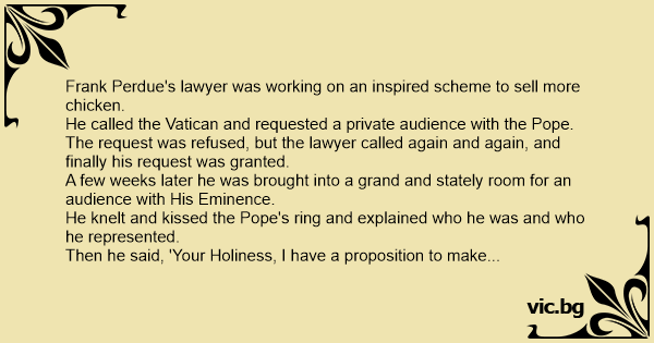 The next day, the Pope called a meeting of the College of Cardinals. 'Dearest colleagues,' the Pope began, 'I have for you some good news and some bad news. The good news is that we are receiving one hundred million from Mr. Frank Perdue to change the words of the Lord's Prayer from 'Give us this day our daily bread' to 'Give us this day our daily chicken.' 'The bad news, friends, is that we're losing the Wonder Bread account.'