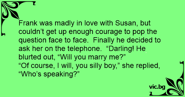 Frank was madly in love with Susan, but couldn’t get up enough courage to pop the question face to face. Finally he decided to ask her on the telephone. “Darling! He blurted out, “Will you marry me?”