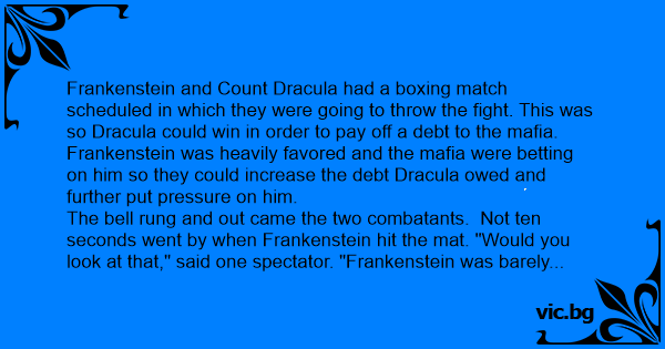Frankenstein and Count Dracula had a boxing match scheduled in which they were going to throw the fight. This was so Dracula could win in order to pay off a debt to the mafia. Frankenstein was heavily favored and the mafia were betting on him so they could increase the debt Dracula owed and further put pressure on him.
