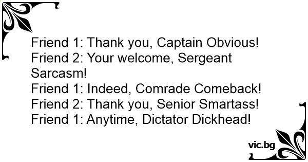 Friend 1: Thank you, Captain Obvious!<br />Friend 2: Your welcome, Sergeant Sarcasm!<br />Friend 1: Indeed, Comrade Comeback!<br />Friend 2: Thank you, Senior Sмаrтаss!<br />Friend 1: Anytime, Dictator Diскhеаd!