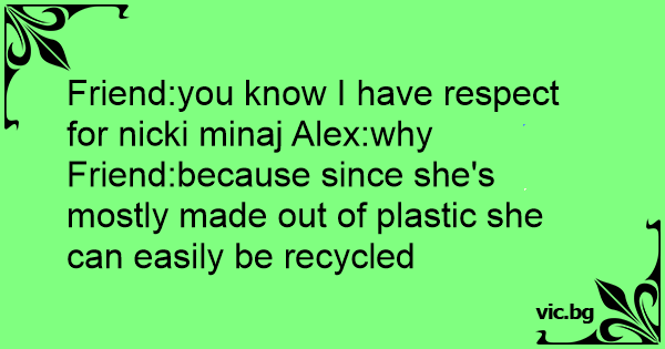 Friend:you know I have respect for nicki minaj Alex:why Friend:because since she's mostly made out of plastic she can easily be recycled