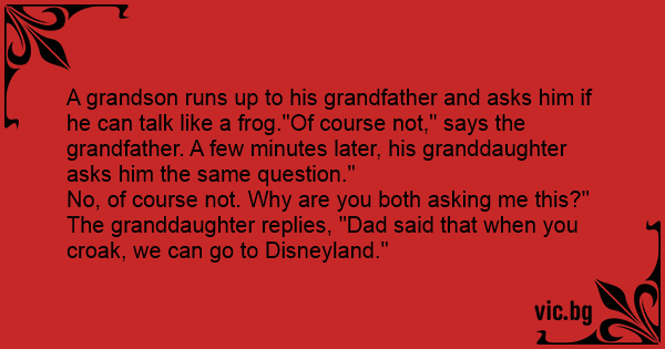 A grandson runs up to his grandfather and asks him if he can talk like a frog."Of course not," says the grandfather. A few minutes later, his granddaughter asks him the same question."
