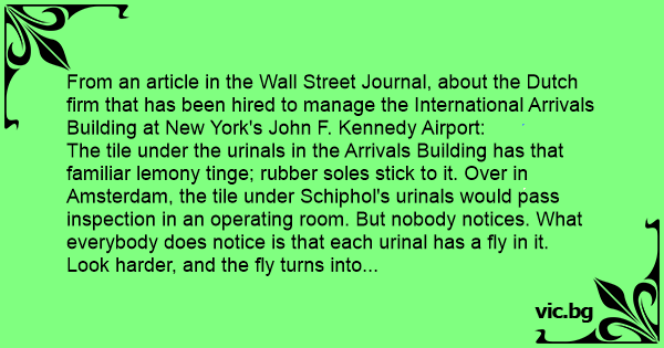The tile under the urinals in the Arrivals Building has that familiar lemony tinge; rubber soles stick to it. Over in Amsterdam, the tile under Schiphol's urinals would pass inspection in an operating room. But nobody notices. What everybody does notice is that each urinаl has a fly in it. Look harder, and the fly turns into the black outline of a fly, etched into the porcelain.