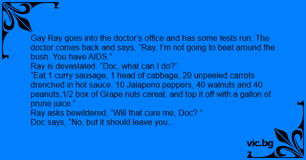 Gаy Ray goes into the doctor’s office and has some tests run. The doctor comes back and says, “Ray, I’m not going to beat around the bush. You have AIDS.”