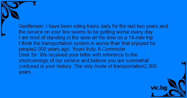 Dear Sir: We received your letter with reference to the shortcomings of our service and believe you are somewhat confused in your history. The only mode of transportation2,000 years ago was by foot.