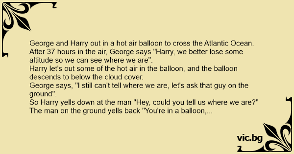 Un ingénieur et un physicien profitent du beau temps et décide de faire une promenade en ballon. Le temps se couvre rapidement, l'ingénieur et le physicien finissent par se perdre complètement dans...