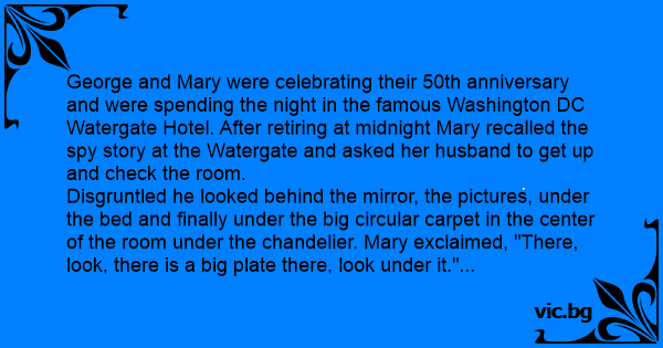 George and Mary were celebrating their 50th anniversary and were spending the night in the famous Washington DC Watergate Hotel. After retiring at midnight Mary recalled the spy story at the Watergate and asked her husband to get up and check the room.