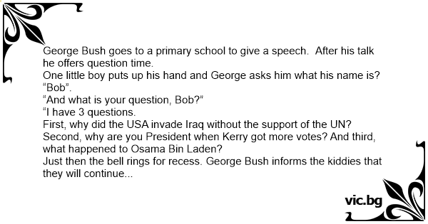 George Bush goes to a primary school to give a speech. After his talk he offers question time.