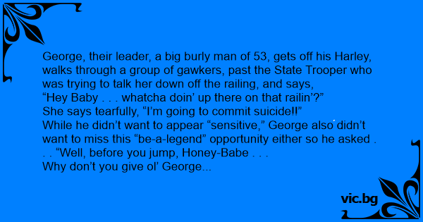 George, their leader, a big burly man of 53, gets off his Harley, walks through a group of gawkers, past the State Trooper who was trying to talk her down off the railing, and says,