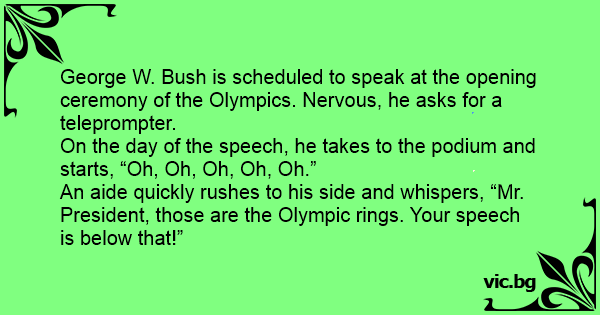 George W. Bush is scheduled to speak at the opening ceremony of the Olympics. Nervous, he asks for a teleprompter. On the day of the speech, he takes to the podium and starts, “Oh, Oh, Oh, Oh, Oh.” An aide quickly rushes to his side and whispers, “Mr. President, those are the Olympic rings. Your speech is below that!”