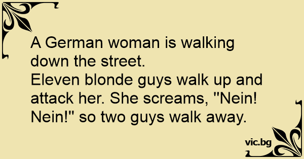 Eleven blonde guys walk up and attack her. She screams, ''Nein! Nein!'' so two guys walk away.