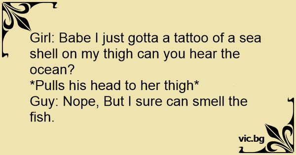 Girl: Ваве I just gotta a tattoo of a sea shell on my thigh can you hear the ocean?<br />*Pulls his head to her thigh* <br />Guy: Nope, But I sure can smell the fish.