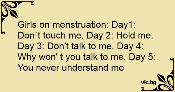 Girls on меnsтruатiоn: Day1: Don`t touch me. Day 2: Hold me. Day 3: Don't talk to me. Day 4: Why won' t you talk to me. Day 5: You never understand me
