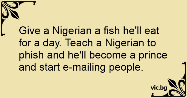 Give a Nigerian a fish he'll eat for a day. Teach a Nigerian to phish and he'll become a prince and start e-mailing people.