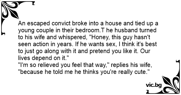 An escaped convict broke into a house and tied up a young couple in their bedroom.T he husband turned to his wife and whispered, "Honey, this guy hasn't seen action in years. If he wants sеx, I think it's best to just go along with it and pretend you like it. Our lives depend on it."