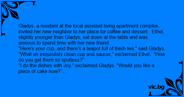 Gladys, a resident at the local assisted living apartment complex, invited her new neighbor to her place for coffee and dessert. Ethel, slightly younger than Gladys, sat down at the table and was anxious to spend time with her new friend.