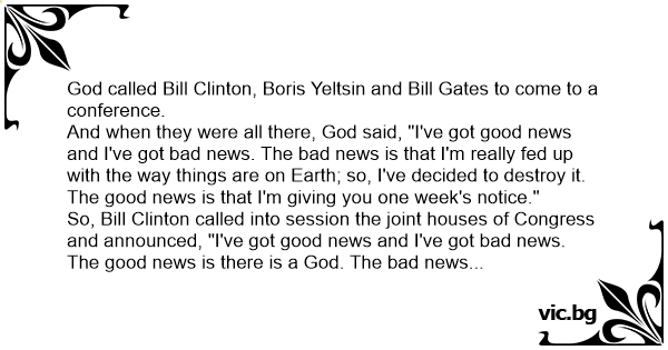 So, Bill Clinton called into session the joint houses of Congress and announced, "I've got good news and I've got bad news. The good news is there is a God. The bad news is that he's going to destroy the Earth in one week."