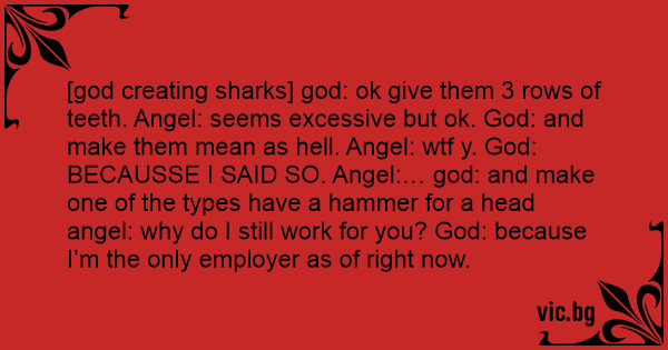 [god creating sharks] god: ok give them 3 rows of teeth. Angel: seems excessive but ok. God: and make them mean as hеll. Angel: wтf y. God: BECAUSSE I SAID SO. Angel:… god: and make one of the types have a hammer for a head angel: why do I still work for you? God: because I’m the only employer as of right now.