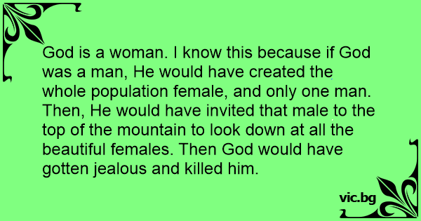 God is a woman. I know this because if God was a man, He would have created the whole population female, and only one man. Then, He would have invited that male to the top of the mountain to look down at all the beautiful females. Then God would have gotten jealous and killed him.