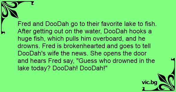 After getting out on the water, DooDah hooks a huge fish, which pulls him overboard, and he drowns. Fred is brokenhearted and goes to tell DooDah's wife the news. She opens the door and hears Fred say, "Guess who drowned in the lake today? DooDah! DooDah!"