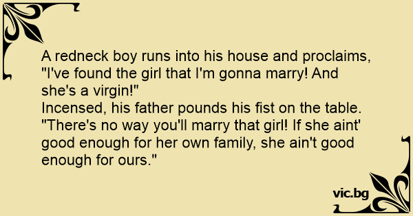 A redneck boy runs into his house and proclaims, "I've found the girl that I'm gonna marry! And she's a virgin!"