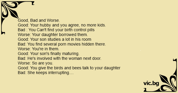 Добър, лошо и много лошо: Добре: Разбрате се с жена си, да нямате повече деца. Лошо: Не можете да намерите презервативите. Много лошо: Дъщеря ви ги е взела назаем. Добре: Синът ви учи много в...