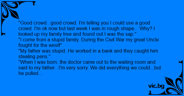 "Good crowd...good crowd. I'm telling you I could use a good crowd. I'm ok now but last week I was in rough shape... Why? I looked up my family tree and found out I was the sap."