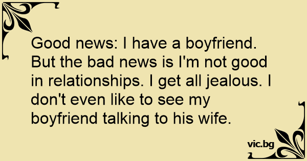 Good news: I have a boyfriend. But the bad news is I'm not good in relationships. I get all jealous. I don't even like to see my boyfriend talking to his wife.