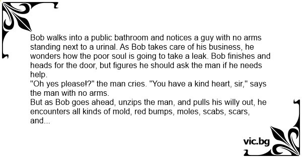 Bob walks into a public bathroom and notices a guy with no arms standing next to a urinаl. As Bob takes care of his business, he wonders how the poor soul is going to take a leak. Bob finishes and heads for the door, but figures he should ask the man if he needs help.