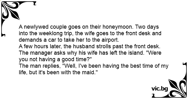 A newlywed couple goes on their honeymoon. Two days into the weeklong trip, the wife goes to the front desk and demands a car to take her to the airport.