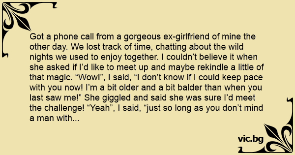 Got a phone call from a gorgeous ex-girlfriend of mine the other day. We lost track of time, chatting about the wild nights we used to enjoy together. I couldn’t believe it when she asked if I’d like to meet up and maybe rekindle a little of that magic. “Wow!”, I said, “I don’t know if I could keep pace with you now! I’m a bit older and a bit balder than when you last saw me!” She giggled and said she was sure I’d meet the challenge! “Yeah”, I said, “just so long as you don’t mind a man with a waistband that’s a few inches wider these days!” She laughed and told me to stop being so silly! She teased me, saying that she thought tubby bald men were cute! “Anyway, I’ve put on a couple of pounds myself!” she giggled ….. So I told her to fuск off.