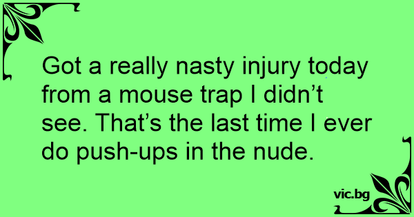 Got a really nasty injury today from a mouse trap I didn’t see. That’s the last time I ever do push-ups in the nudе.