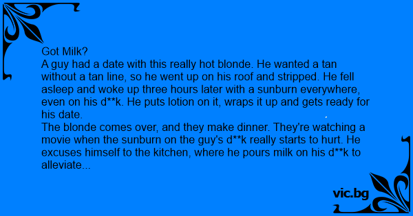 The blonde comes over, and they make dinner. They're watching a movie when the sunburn on the guy's d**k really starts to hurt. He excuses himself to the kitchen, where he pours milk on his d**k to alleviate the burn. The blonde, who has followed him, peeks in the kitchen and says to herself, "So that's how they load them."