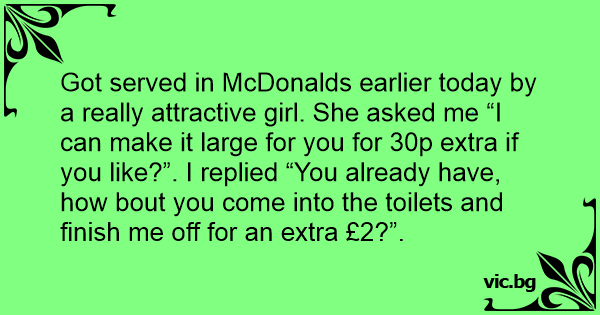 Got served in McDonalds earlier today by a really attractive girl. She asked me “I can make it large for you for 30p extra if you like?”. I replied “You already have, how bout you come into the toilets and finish me off for an extra £2?”.