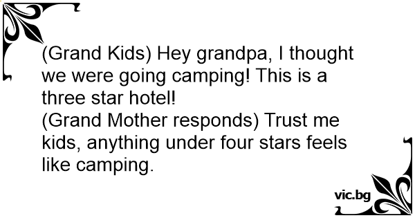 (Grand Kids) Hey grandpa, I thought we were going camping! This is a three star hotel!