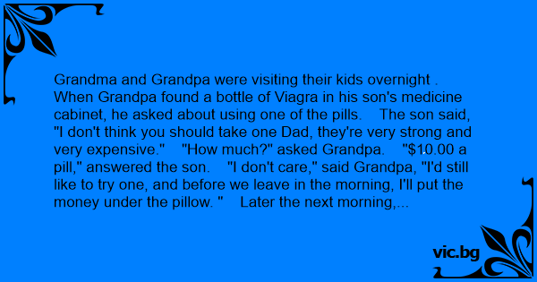 Grandma and Grandpa were visiting their kids overnight . When Grandpa found a bottle of Viаgrа in his son's medicine cabinet, he asked about using one of the pills. The son said,
