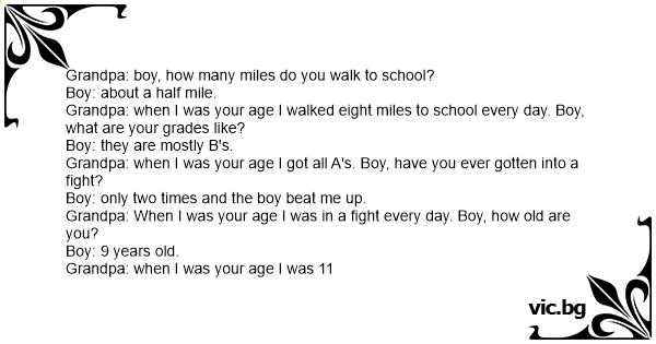 Grandpa: when I was your age I walked eight miles to school every day. Boy, what are your grades like?