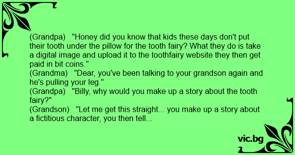 (Grandpa) "Honey did you know that kids these days don't put their tooth under the pillow for the tooth fairy? What they do is take a digital image and upload it to the toothfairy website they then get paid in bit coins."