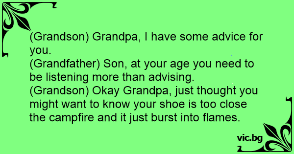 (Grandson) Okay Grandpa, just thought you might want to know your shoe is too close the campfire and it just burst into flames.