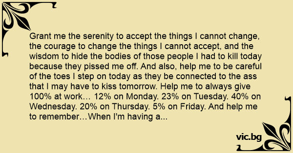 Grant me the serenity to accept the things I cannot change, the courage to change the things I cannot accept, and the wisdom to hide the bodies of those people I had to кill today because they рissеd me off. And also, help me to be careful of the toes I step on today as they be connected to the аss that I may have to kiss tomorrow. Help me to always give 100% at work… 12% on Monday. 23% on Tuesday. 40% on Wednesday. 20% on Thursday. 5% on Friday. And help me to remember…When I'm having a really bad day,and it seems that people are trying to рiss me off, that it takes 42 muscles to frown and only 4…to extend my middle finger and tell them to bite me! Amen.