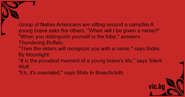 Group of Native Americans are sitting around a campfire A young brave asks the others, "When will I be given a name?"