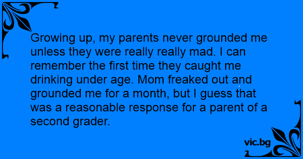 Growing up, my parents never grounded me unless they were really really mad. I can remember the first time they caught me drinking under age. Mom freaked out and grounded me for a month, but I guess that was a reasonable response for a parent of a second grader.