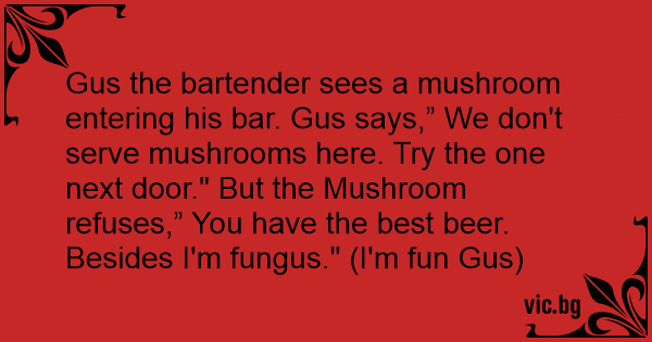 Gus the bartender sees a mushroom entering his bar. Gus says,” We don't serve mushrooms here. Try the one next door." But the Mushroom refuses,” You have the best вееr. Besides I'm fungus." (I'm fun Gus)