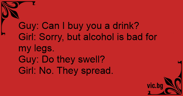 Kluk: "Chceš se něčeho napít?" Holka: "Raději ne, alkohol má špatný vliv na moje nohy." Kluk: "Copak? Opuchají ti?" Holka: "Nee, to ne, ale roztahují se."