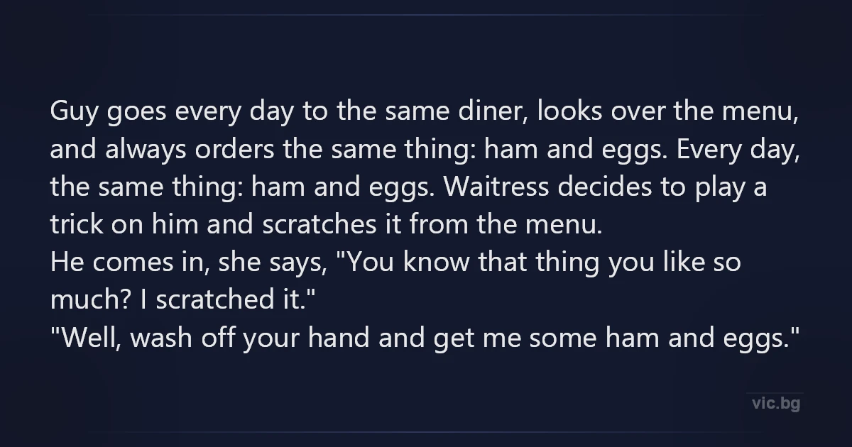 Guy goes every day to the same diner, looks over the menu, and always orders the same thing: ham and eggs. Every day, the same thing: ham and eggs. Waitress decides to play a trick on him and scratches it from the menu. He comes in, she says, "You know that thing you like so much? I scratched it." "Well, wash off your hand and get me some ham and eggs."